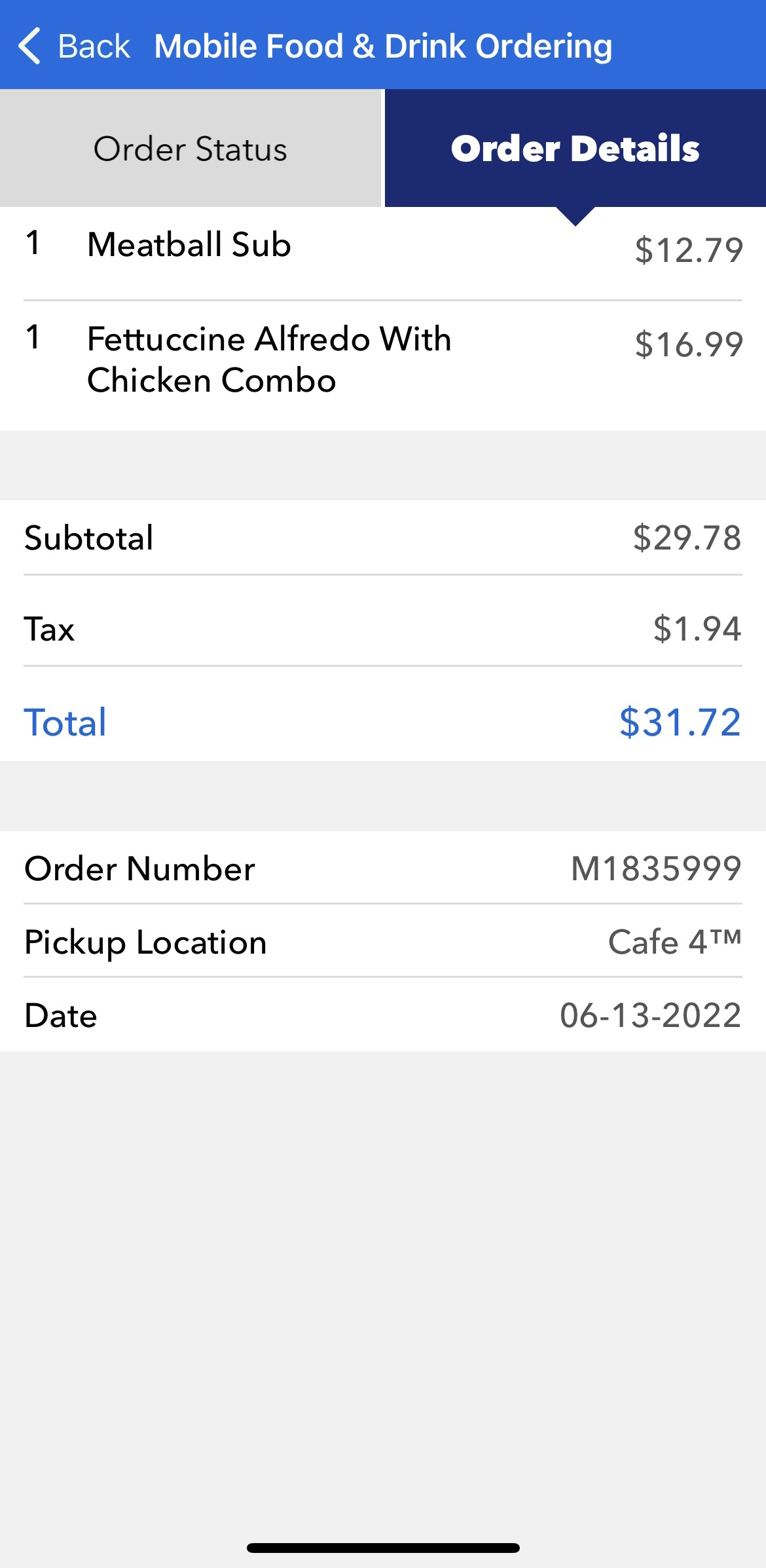 우리는 미트볼 샌드위치와 치킨 알프레도 파스타를 먹었는데 세금포함 $31.72가 나왔다.